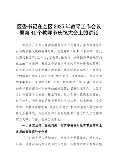 【七哥公文】2025年:区委书记在全区2025年教育工作会议暨第41个教师节庆祝大会上的讲话+更多免费公文+VX:QiGeGongWen2024