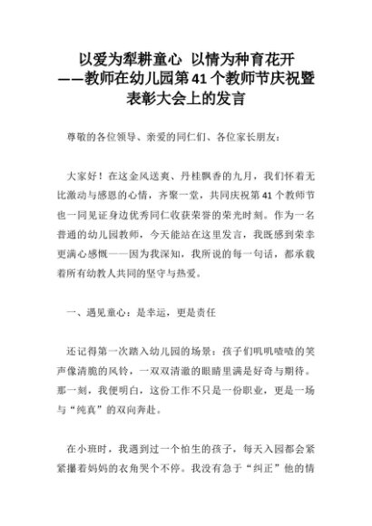 【七哥公文】2025年:以爱为犁耕童心 以情为种育花开 ——教师在幼儿园第41个教师节庆祝暨表彰大会上的发言+更多免费公文+VX:QiGeGongWen2024