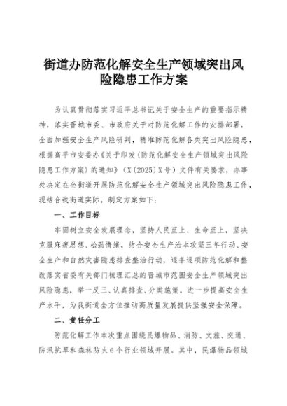 / 【七哥公文】2025年:街道办防范化解安全生产领域突出风险隐患工作方案+更多免费公文+VX:QiGeGongWen2024