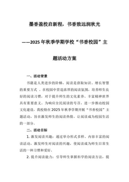 【七哥公文】2025年:2025年秋季学期学校“书香校园”主题活动方案:墨香盈校启新程,书香致远润秋光+更多免费公文+VX:QiGeGongWen2024