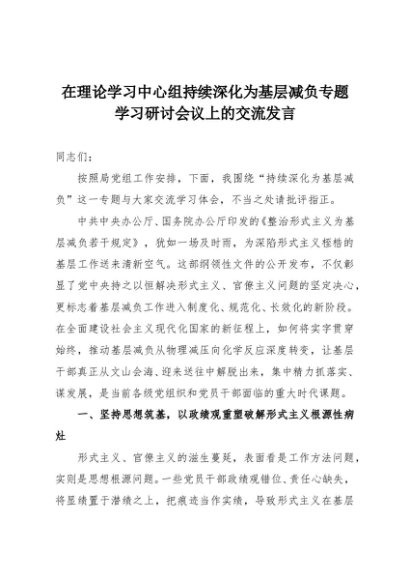 【七哥公文】2025年:在理论学习中心组持续深化为基层减负专题学习研讨会议上的交流发言+更多免费公文+VX:QiGeGongWen2024