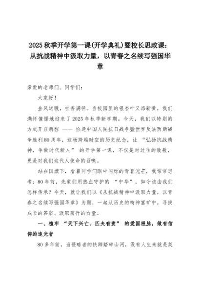 【七哥公文】2025年:2025秋季开学第一课(开学典礼)暨校长思政课:从抗战精神中汲取力量,以青春之名续写强国华章+更多免费公文+VX:QiGeGongWen2024