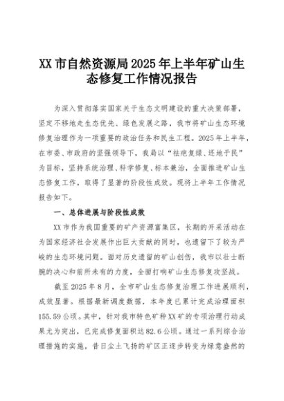 【七哥公文】2025年:XX市自然资源局2025年上半年矿山生态修复工作情况报告+更多免费公文+VX:QiGeGongWen2024