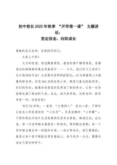 【七哥公文】2025年:初中校长2025年秋季 “开学第一课” 主题讲话:坚定信念,向阳成长+更多免费公文+VX:QiGeGongWen2024