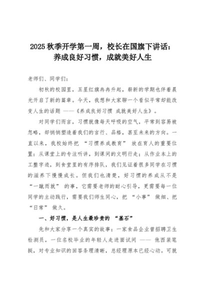 【七哥公文】2025年:2025秋季开学第一周,校长在国旗下讲话:养成良好习惯,成就美好人生+更多免费公文+VX:QiGeGongWen2024