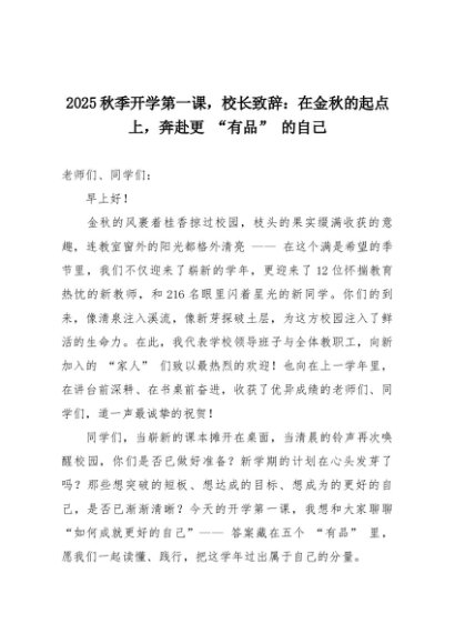 【七哥公文】2025年:2025秋季开学第一课,校长致辞:在金秋的起点上,奔赴更 “有品” 的自己+更多免费公文+VX:QiGeGongWen2024