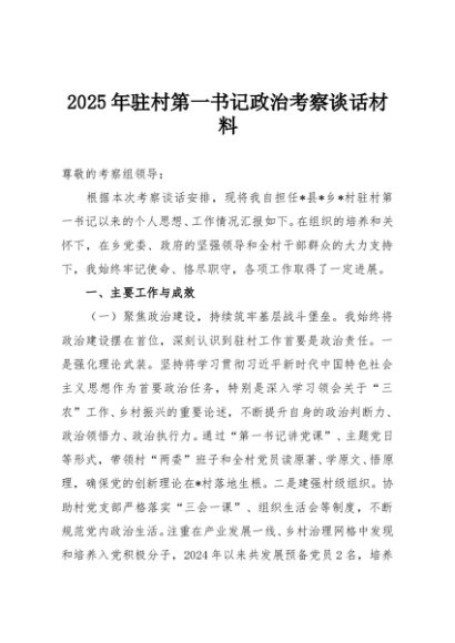 / 【七哥公文】2025年:2025年驻村第一书记政治考察谈话材料+更多免费公文+VX:QiGeGongWen2024