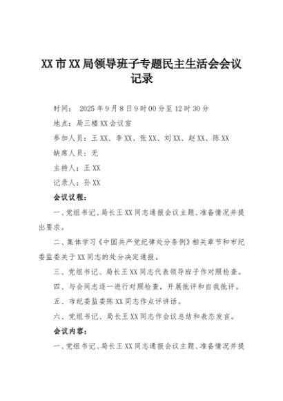 / 【七哥公文】2025年:XX市XX局领导班子专题民主生活会会议记录+更多免费公文+VX:QiGeGongWen2024