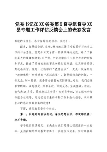 【七哥公文】2025年:党委书记在XX省委第X督导组督导XX县专题工作评估反馈会上的表态发言+更多免费公文+VX:QiGeGongWen2024