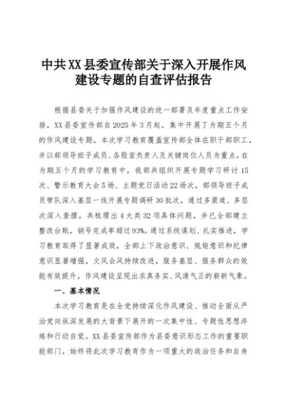 【七哥公文】2025年:中共XX县委宣传部关于深入开展作风建设专题的自查评估报告+更多免费公文+VX:QiGeGongWen2024