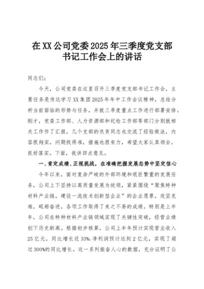 【七哥公文】2025年:在XX公司党委2025年三季度党支部书记工作会上的讲话+更多免费公文+VX:QiGeGongWen2024