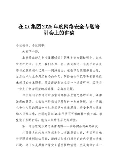 / 【七哥公文】2025年:在XX集团2025年度网络安全专题培训会上的讲稿+更多免费公文+VX:QiGeGongWen2024