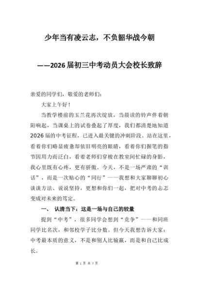 【七哥公文】2025年:2026届初三中考动员大会校长致辞:少年当有凌云志,不负韶华战今朝+更多免费公文+VX:QiGeGongWen2024