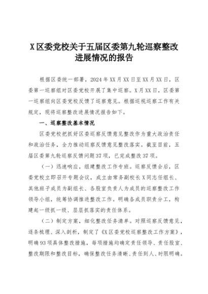 / 【七哥公文】2025年:X区委党校关于五届区委第九轮巡察整改进展情况的报告+更多免费公文+VX:QiGeGongWen2024