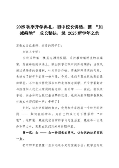 【七哥公文】2025年:2025秋季开学典礼,初中校长讲话:携 “加减乘除” 成长秘诀,赴 2025新学年之约+更多免费公文+VX:QiGeGongWen2024