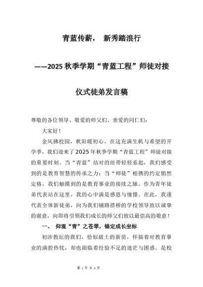 【七哥公文】2025年:2025秋季学期“青蓝工程”师徒对接仪式徒弟发言稿:青蓝传薪, 新秀踏浪行+更多免费公文+VX:QiGeGongWen2024