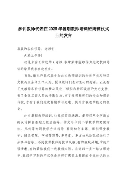 【七哥公文】2025年:参训教师代表在2025年暑期教师培训班闭班仪式上的发言+更多免费公文+VX:QiGeGongWen2024