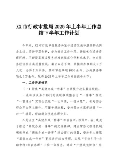 【七哥公文】2025年:XX市行政审批局2025年上半年工作总结下半年工作计划+更多免费公文+VX:QiGeGongWen2024