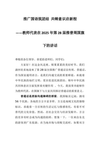 【七哥公文】2025年:教师代表在2025年第28届推普周国旗下的讲话:推广国语筑团结 共铸意识启新程+更多免费公文+VX:QiGeGongWen2024
