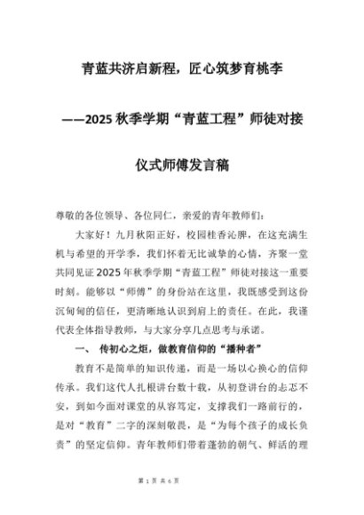 【七哥公文】2025年:2025秋季学期“青蓝工程”师徒对接仪式师傅发言稿:青蓝共济启新程,匠心筑梦育桃李+更多免费公文+VX:QiGeGongWen2024