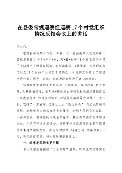 【七哥公文】2025年:在县委常规巡察组巡察17个村党组织情况反馈会议上的讲话+更多免费公文+VX:QiGeGongWen2024