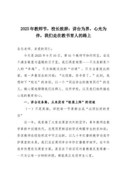 【七哥公文】2025年:2025年教师节,校长致辞:讲台为界,心光为伴,我们走在教书育人的路上+更多免费公文+VX:QiGeGongWen2024