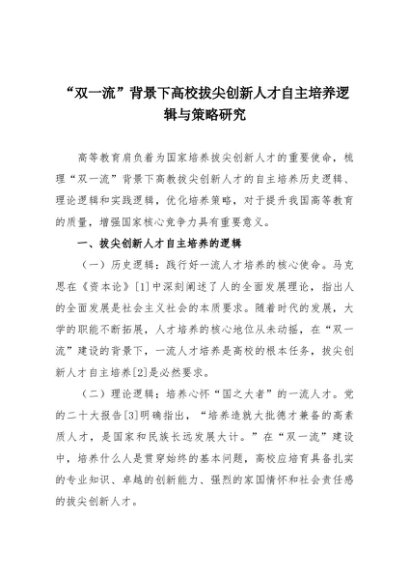 【七哥公文】2025年:“双一流”背景下高校拔尖创新人才自主培养逻辑与策略研究+更多免费公文+VX:QiGeGongWen2024