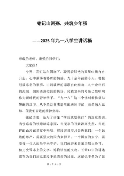 【七哥公文】2025年:2025年九一八学生讲话稿:铭记山河殇,共筑少年强+更多免费公文+VX:QiGeGongWen2024