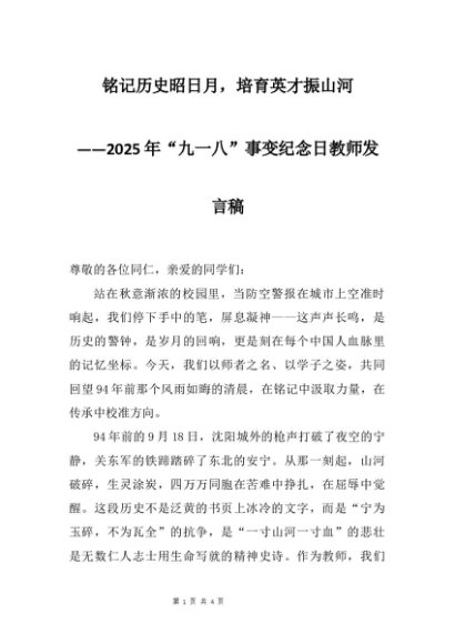 【七哥公文】2025年:2025年“九一八”事变纪念日教师发言稿:铭记历史昭日月,培育英才振山河+更多免费公文+VX:QiGeGongWen2024