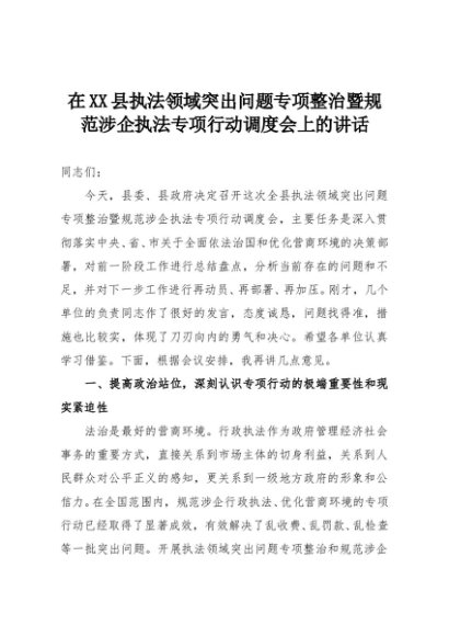 【七哥公文】2025年:在XX县执法领域突出问题专项整治暨规范涉企执法专项行动调度会上的讲话+更多免费公文+VX:QiGeGongWen2024