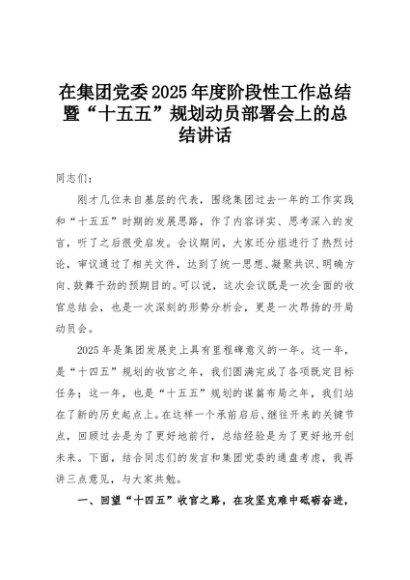 【七哥公文】2025年:在集团党委2025年度阶段性工作总结暨“十五五”规划动员部署会上的总结讲话+更多免费公文+VX:QiGeGongWen2024