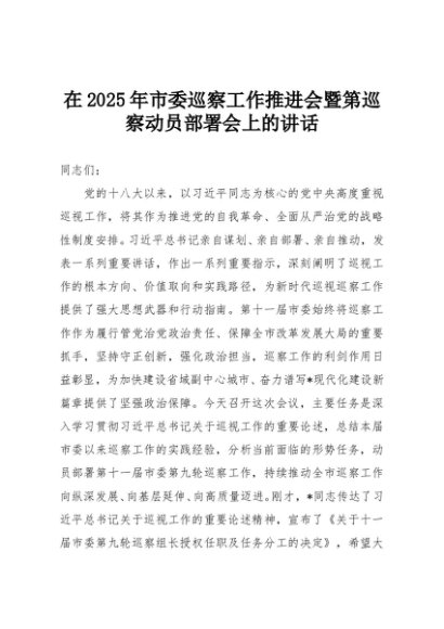 【七哥公文】2025年:在2025年市委巡察工作推进会暨第巡察动员部署会上的讲话+更多免费公文+VX:QiGeGongWen2024