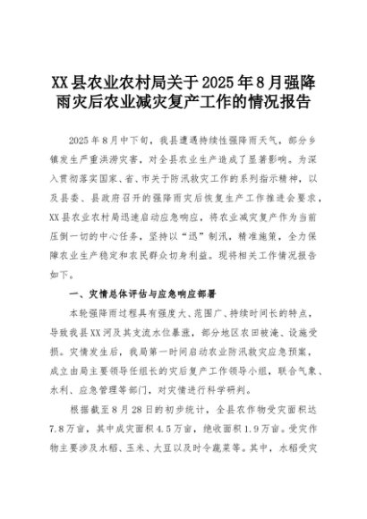 【七哥公文】2025年:XX县农业农村局关于2025年8月强降雨灾后农业减灾复产工作的情况报告+更多免费公文+VX:QiGeGongWen2024