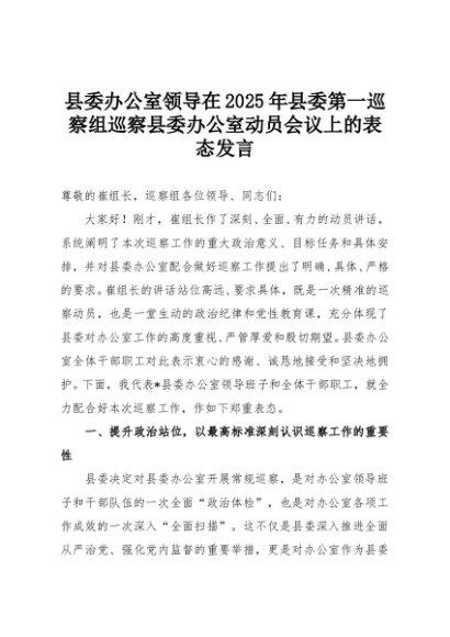 【七哥公文】2025年:县委办公室领导在2025年县委第一巡察组巡察县委办公室动员会议上的表态发言+更多免费公文+VX:QiGeGongWen2024