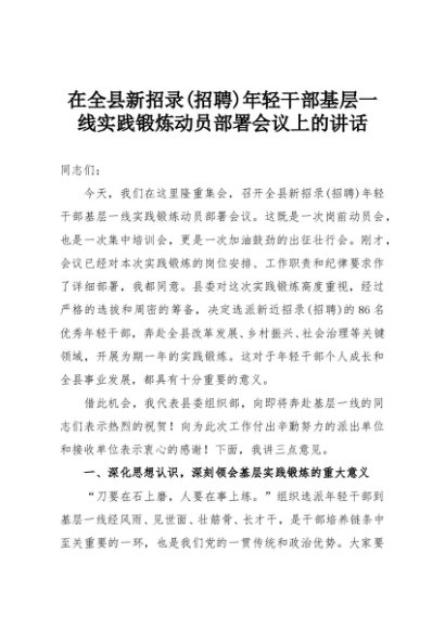 【七哥公文】2025年:在全县新招录(招聘)年轻干部基层一线实践锻炼动员部署会议上的讲话+更多免费公文+VX:QiGeGongWen2024