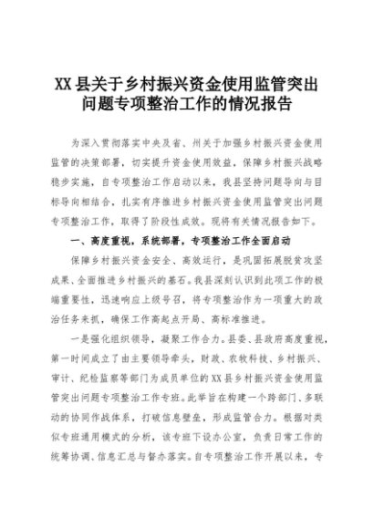 【七哥公文】2025年:XX县关于乡村振兴资金使用监管突出问题专项整治工作的情况报告+更多免费公文+VX:QiGeGongWen2024