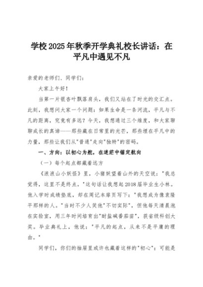 【七哥公文】2025年:学校2025年秋季开学典礼校长讲话:在平凡中遇见不凡+更多免费公文+VX:QiGeGongWen2024