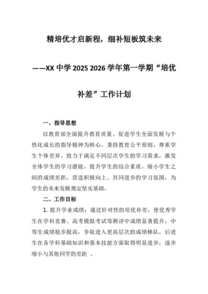 【七哥公文】2025年:XX中学2025 2026学年第一学期“培优补差”工作计划:精培优才启新程,细补短板筑未来+更多免费公文+VX:QiGeGongWen2024