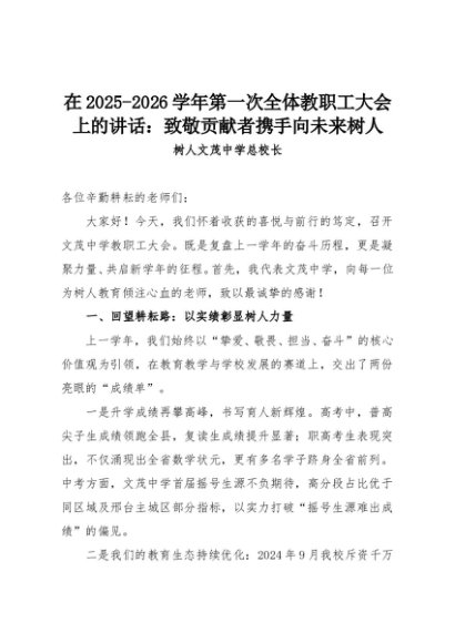 【七哥公文】2025年:在2025-2026学年第一次全体教职工大会上的讲话:致敬贡献者携手向未来树人+更多免费公文+VX:QiGeGongWen2024