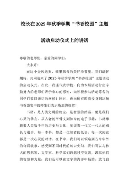 【七哥公文】2025年:校长在2025年秋季学期“书香校园”主题活动启动仪式上的讲话+更多免费公文+VX:QiGeGongWen2024