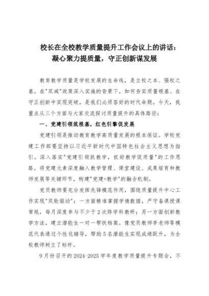 【七哥公文】2025年:校长在全校教学质量提升工作会议上的讲话:凝心聚力提质量,守正创新谋发展+更多免费公文+VX:QiGeGongWen2024