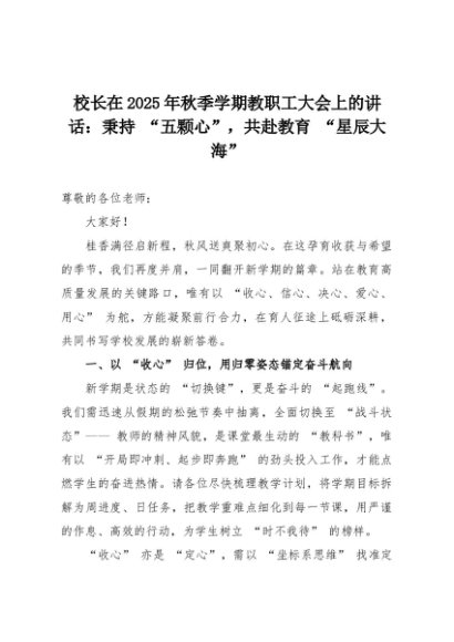【七哥公文】2025年:校长在2025年秋季学期教职工大会上的讲话:秉持 “五颗心”,共赴教育 “星辰大海”+更多免费公文+VX:QiGeGongWen2024