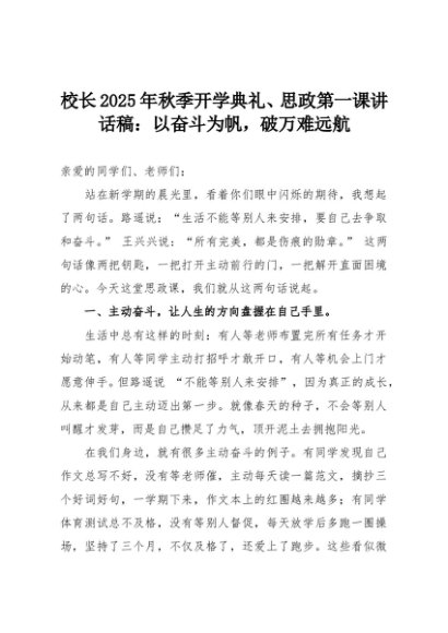 【七哥公文】2025年:校长2025年秋季开学典礼、思政第一课讲话稿:以奋斗为帆,破万难远航+更多免费公文+VX:QiGeGongWen2024