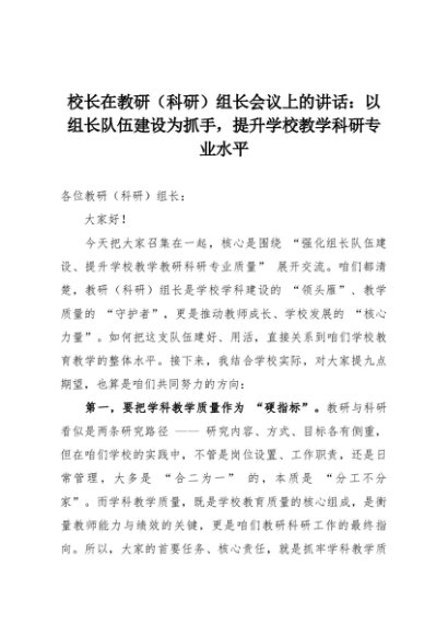 【七哥公文】2025年:校长在教研(科研)组长会议上的讲话:以组长队伍建设为抓手,提升学校教学科研专业水平+更多免费公文+VX:QiGeGongWen2024