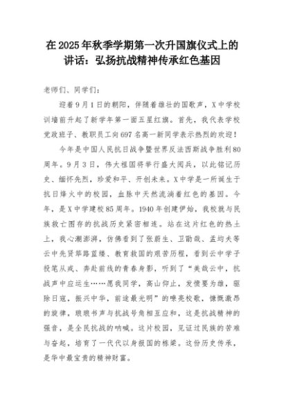 【七哥公文】2025年:在2025年秋季学期第一次升国旗仪式上的讲话:弘扬抗战精神传承红色基因+更多免费公文+VX:QiGeGongWen2024