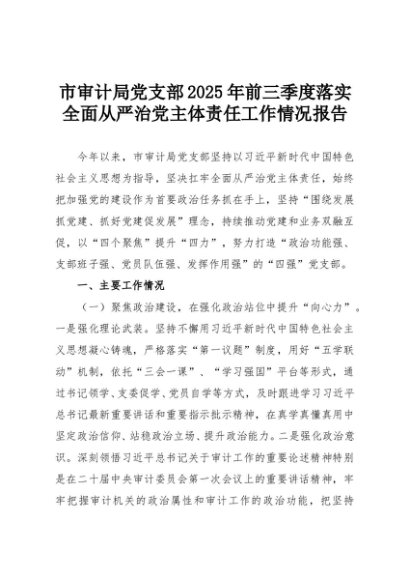 【七哥公文】2025年:市审计局党支部2025年前三季度落实全面从严治党主体责任工作情况报告+更多免费公文+VX:QiGeGongWen2024