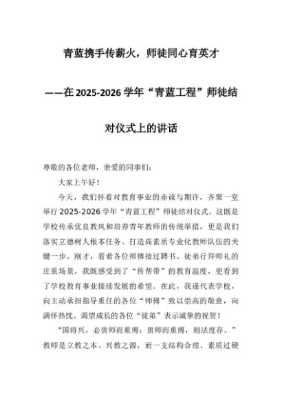 【七哥公文】2025年:在2025-2026学年“青蓝工程”师徒结对仪式上的讲话:青蓝携手传薪火,师徒同心育英才+更多免费公文+VX:QiGeGongWen2024