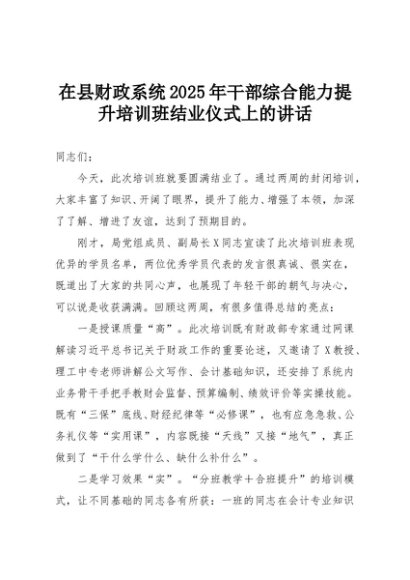 【七哥公文】2025年:在县财政系统2025年干部综合能力提升培训班结业仪式上的讲话+更多免费公文+VX:QiGeGongWen2024