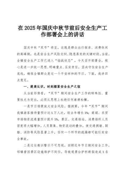 / 【七哥公文】2025年:在2025年国庆中秋节前后安全生产工作部署会上的讲话+更多免费公文+VX:QiGeGongWen2024