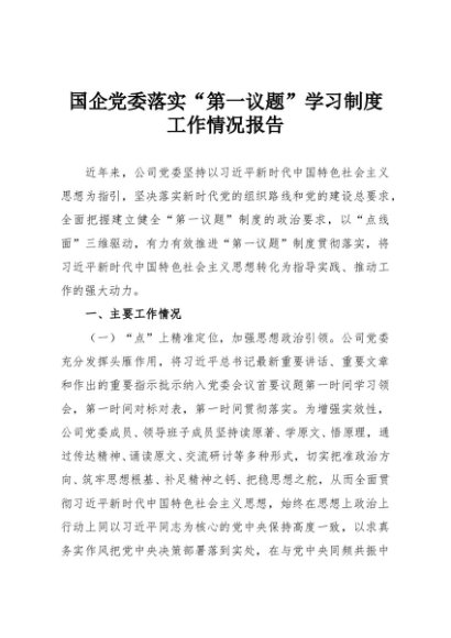 / 【七哥公文】2025年:国企党委落实“第一议题”学习制度工作情况报告+更多免费公文+VX:QiGeGongWen2024